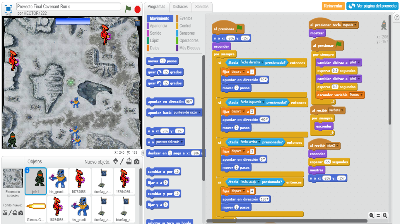 Durante el primer parcial del presente semestre realizamos un videojuego con el programa de scratch, con el cual de una manera rápida y fácil de entender, colocamos diversos comandos con los que el jugador podía controlar al personaje del nivel. De tal manera que surgió la idea de crear un juego inspírado en el universo de halo, en el cual nuestro personaje deberá cruzar un campo lleno de enemigos hasta llegar a un punto de control.